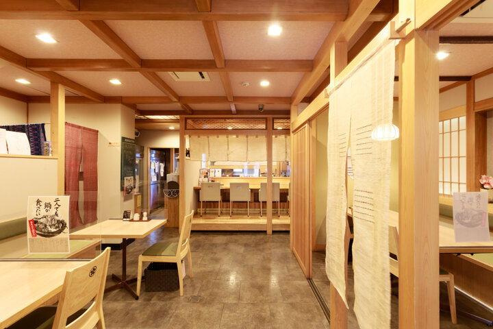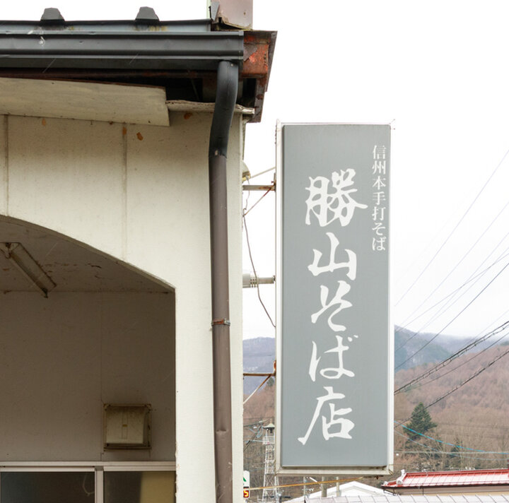 JR青柳駅から徒歩15分ほど、地元の人が集う公共温泉施設「金鶏の湯」に隣接する「勝山そば」は、信州ならではの田舎そばがおいしいお店です。細かく挽いたそば殻をそば粉に練り込む挽きぐるみのそばは太めで黒く、風味が豊か。お湯を入れてうどんのように足踏みでこねる独特の製法で、のど越しがよく、コシのある歯応えが楽しめます。