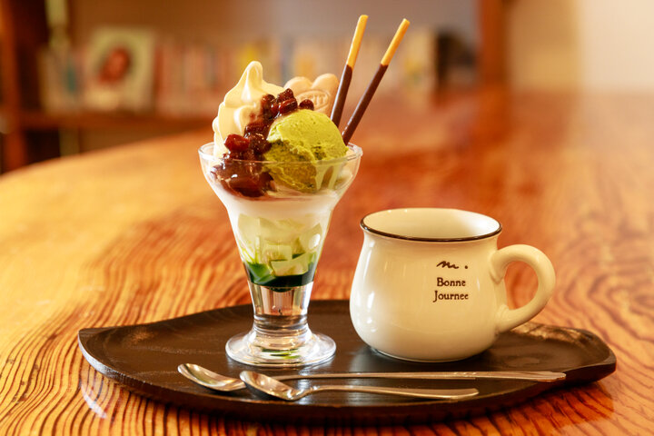 「白玉抹茶パフェ」660円と「有機コーヒー」418円