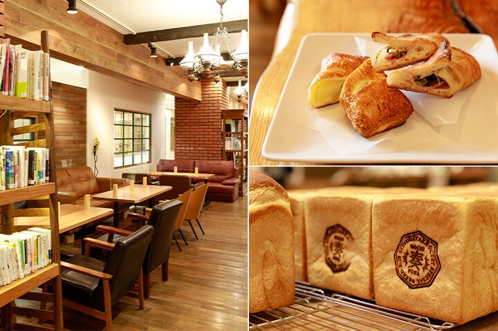 (左)ウッディなインテリアで居心地のいい店内(右上)さっぱりした甘さの「りんごのデニッシュ」242円と、ほどよい塩味が食欲をそそる「野沢菜ベーコンフランス」275円(右下)一番人気の「奏」1.5斤540円は、添加物不使用の体にやさしい食パン