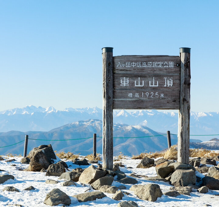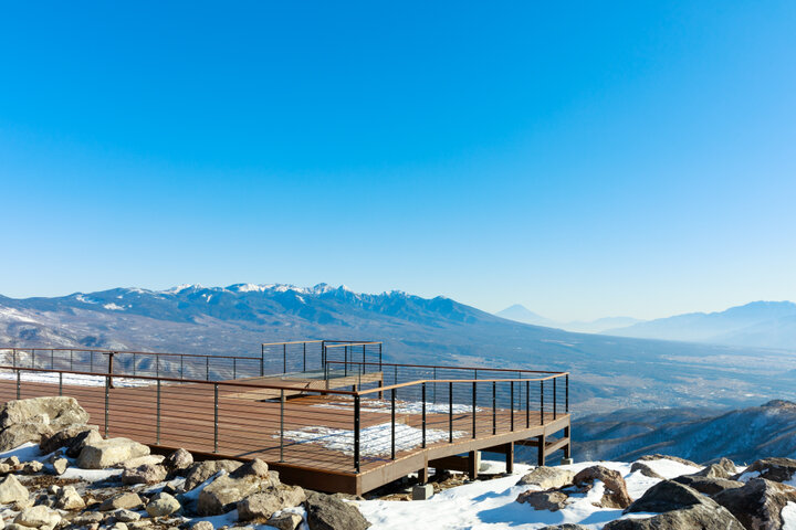 茅野の最新絶景スポットがここ、昨年12月にオープンした「車山展望テラス」です。冬にはスキー場としても賑わう車山は、百名山で知られる霧ヶ峰の主峰。標高1925mの山頂に設置された幅30m、奥行き10mの木製テラスからは、富士山や八ヶ岳、南アルプス、北アルプスなど、360°の壮大なパノラマビューが楽しめます。 山麓の駐車場から山頂までは4人乗りリフトを2本乗り継いで、片道約15分。下りのリフトでは、眼下に広がる白樺湖や正面にそびえる蓼科山などの雄大な景色も一望できます。