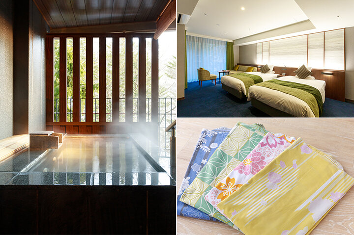 (左・右上)滝ノ湯川に面した露天風呂付きのリバーフロントテラスの部屋(右下)ロビーに女性用の選べる浴衣を用意