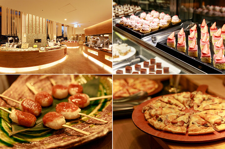 (左上)ピザを焼く大きな石窯と約15mのライブキッチンカウンターを備えたレストラン(左下)信州の郷土料理・五平餅も(右上)スイーツコーナーにはイチゴのタルトなど約10種類が並ぶ(右下)焼き立てピザはマルゲリータやペスカトーレなど4種類