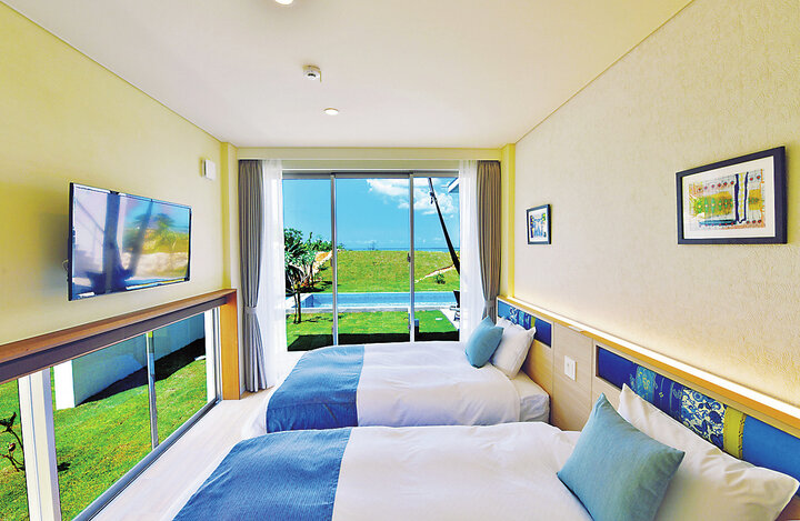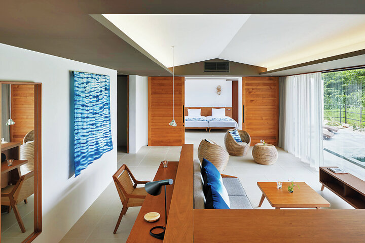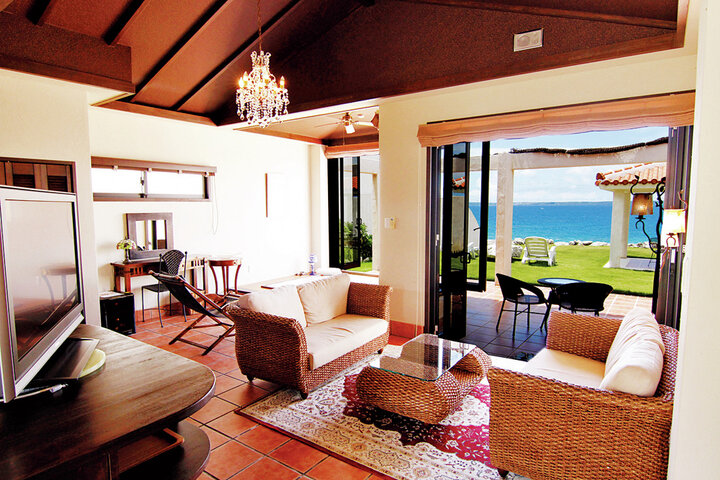 開放感ある客室は、平屋建ての「シーサイドスイート」、プライベートプール付き「サンセットスイート」、2階建ての「ロイヤルスイート」の3タイプ