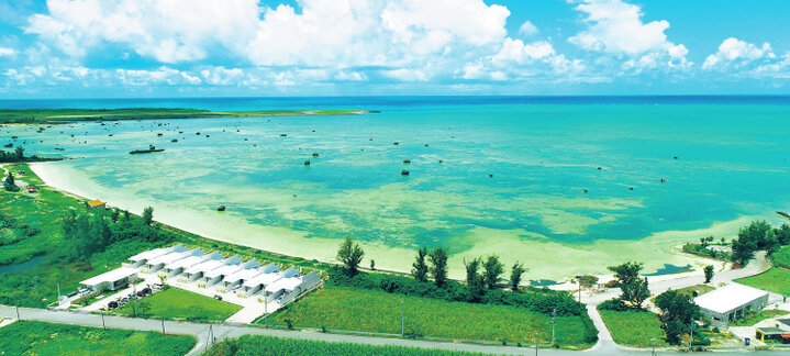 波が穏やかな遠浅の海が広がる。下地島空港の進入灯点検橋も眺められる
