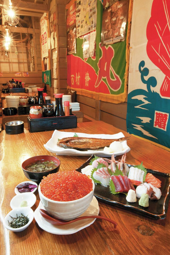 「オイサー!」の掛け声とともにいくらが盛られる元祖つっこ飯2035円~、刺身6点盛り2178円(写真は2人前)など盛り付けも豪快
