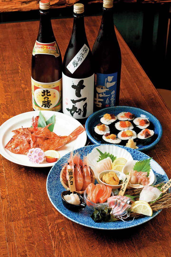 北海道各地で水揚げされた新鮮な魚介を毎日直送。大漁旗が飾られる活気ある店内で北海道の幸が堪能できます。日によって入荷する食材が変わるのでスタッフに気軽に尋ねてみて。近くに支店が4軒あります。