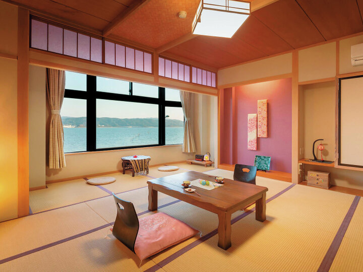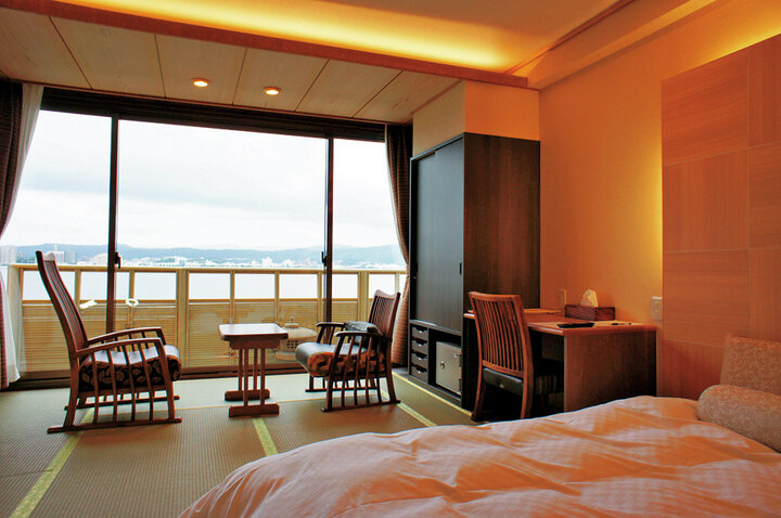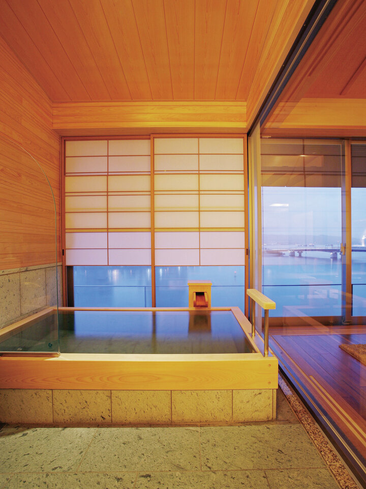 宍道湖を眺めながら温泉につかれる檜風呂付きの客室