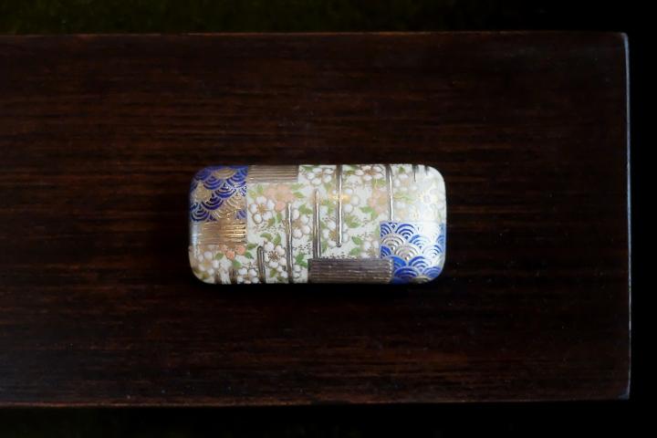 淡いピンク色の桜がきれいな「桜青海波紋(さくらせいかいはもん)」は、日本の「春の庭」をイメージした薩摩ボタン。 縦に幾本か描かれた太めのラインは竹の垣根。垣根の横には満開の桜がいっぱいです。 左右にはきらきら輝く鹿児島の海をイメージして、プラチナと金で青海波の文様を組み合わせています。