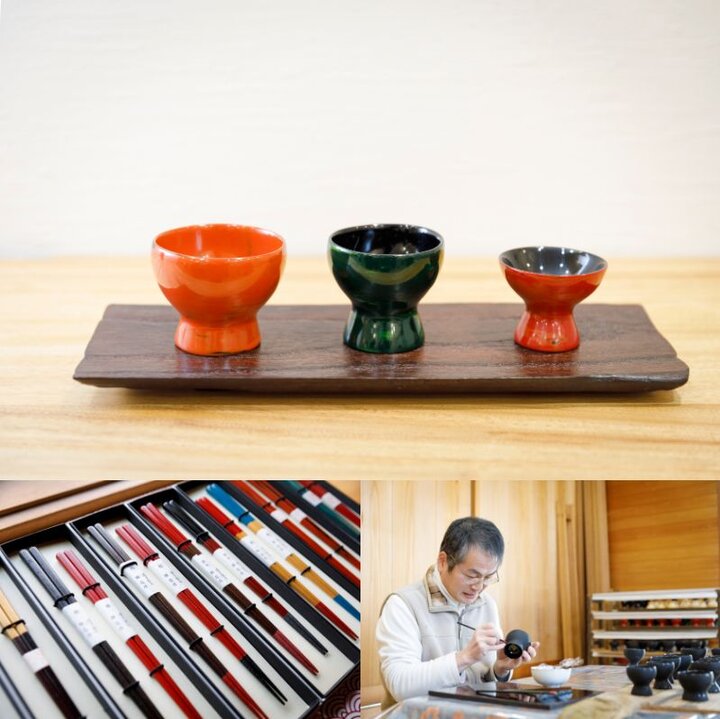 上/ひょうたんの盃6600円~ 左下/抗菌性のある漆で仕上げた箸は箸先に料理がくっつきにくい 右下/塗っては乾かして磨くという根気のいる仕事を繰り返すことで美しい漆器が生まれる