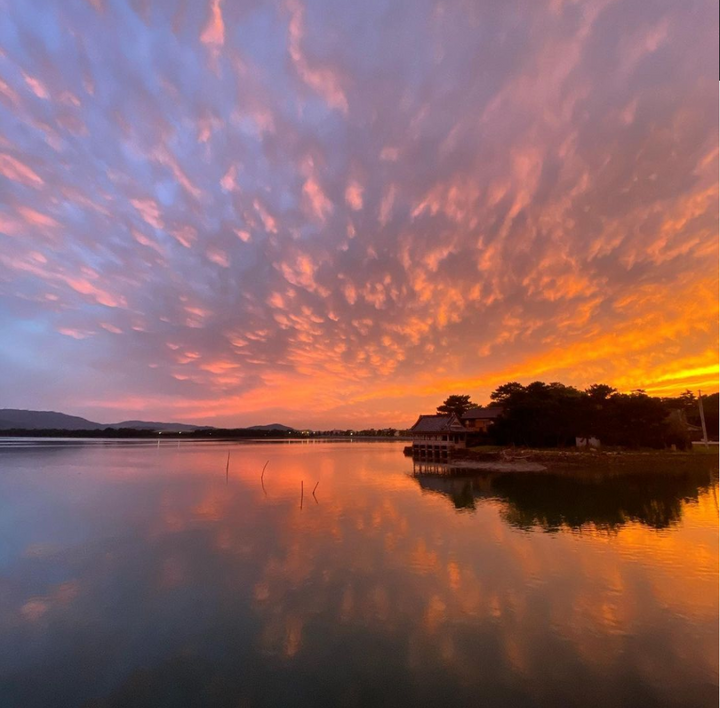 妹背山を紅く染める夕日。水面に空が映り込み、幻想的なパノラマ風景が現れる