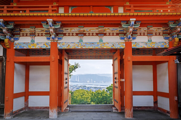 108段の石段を登った朱塗りの楼門から和歌浦を一望する