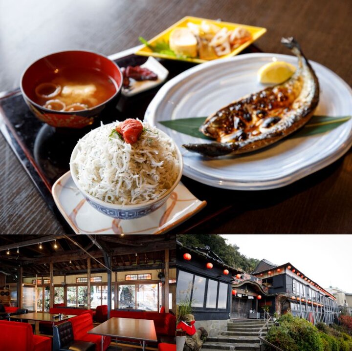 和歌浦湾を見渡せる食堂。歴史ある老舗料亭旅館をリノベーションし、当時の趣を残した重厚な建物に、約80席の客席がゆったりと配置されています。ランチメニューのなかでもおすすめなのは和歌浦特産の灰干しさんま。特別な製法で魚本来の持つ旨みを封じ込めた香ばしいさんまと、惜しげもなくたっぷりと盛られた新鮮なしらす丼に食が進みます。