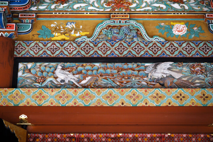 社殿の彫刻は左甚五郎の作品。写真は鷹と雉の彫刻。白い鳥2羽が鷹で右の鷹の足元には茶色い雉が捕まっている