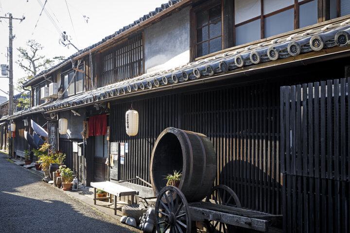 写真は黒江ぬりもの館。細い路地に連なる 連子格子(れんじこうし)の町家はのこぎりの歯に例えられ、建物が敷地に対して少し斜めに建てられているのは、一説に荷車などを止める際に考えられた知恵だといわれる