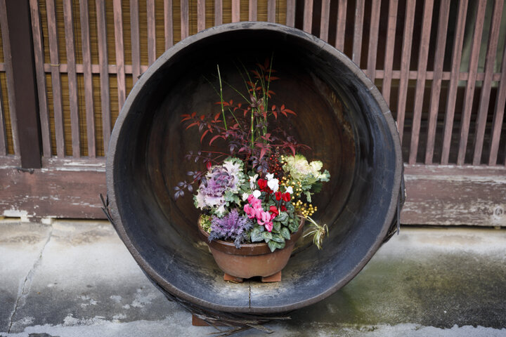 入り組んだ路地には漆の精製に使用されたくろめ桶が植物とともに飾られている