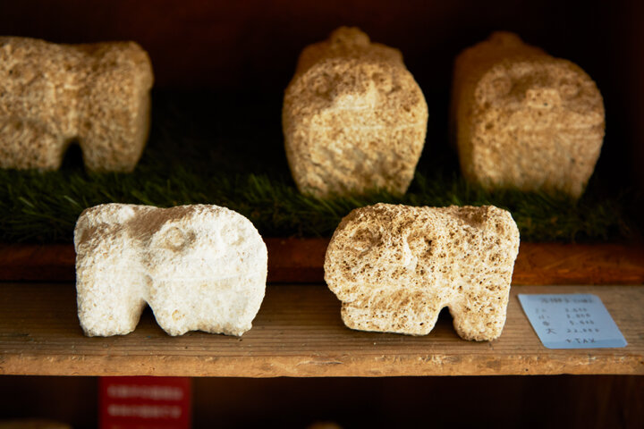 若山さんがモデルにするのは古来から人々の暮らしを守ってきた“村落シーサー”。「沖縄の庶民が、家族や集落の人のための幸せや繁栄を願い作っていた」ことがシーサーの何よりの魅力だと言います。どれひとつとして同じものがなく、肩の力を抜いてくれる素朴でほっこりした表情が、持ち主の心を解きほぐします。現在使用している石灰岩は2種類だそうで、白(右)が勝連(かつれん)で採れる“勝連トラバーチン”、茶色(左)港川で採れる“粟石”(あわいし)。ともにインテリアになじむ淡い色合いで、現代の人々の暮らしにもすんなりと溶け込んでくれそうです。