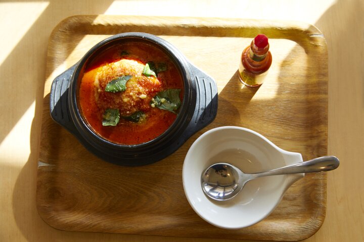 昔ながらのシンプルなゆし豆腐だけでなく、味の変化が楽しいアレンジメニューも豊富。トマトチーズゆし豆腐は、ランチタイムにやってくる地元の大学生や近所の人々にも人気。酸味のあるトマトソースにとろりとしたモッツァレラチーズは相性抜群で、ほのかな甘みと苦みを添えるバジルの香りもアクセントになっています。
