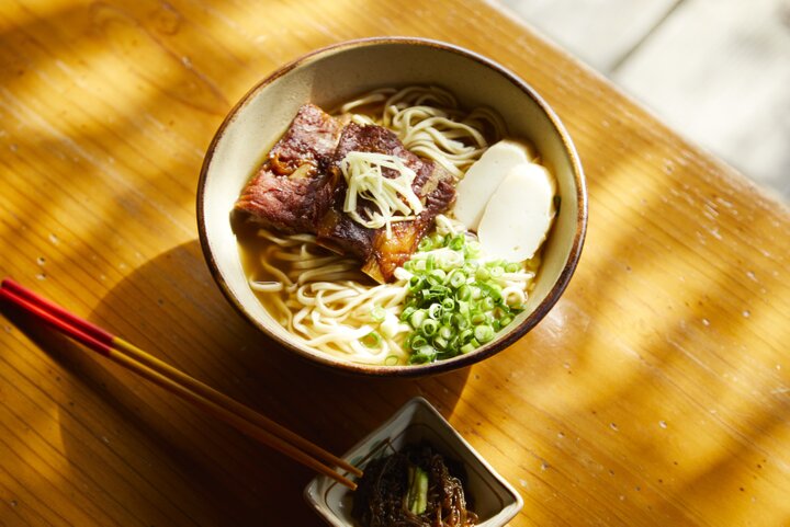 貴重な建物の中でいただけるのは本ソーキそば。スープは3日間かけ徹底的に豚骨の油を取り除くことで、すっきり澄み切った味に整えているそう。もっちりとしてコシのある麺が絡み合うと、箸が止まらぬおいしさに。柔らかくジューシーな豚肉の甘みもさらりとした汁に溶け込み、アクセントの生姜が効いています。忘れられない沖縄の味として思い出に残りそう。