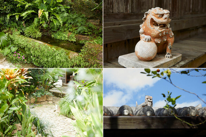 どこから庭を見渡しても、豊かな木花に包まれている。古来の沖縄の池の形を留めていると言われる庭の一角も必見 赤瓦の屋根の上から、訪れる人々を見下ろすシーサー