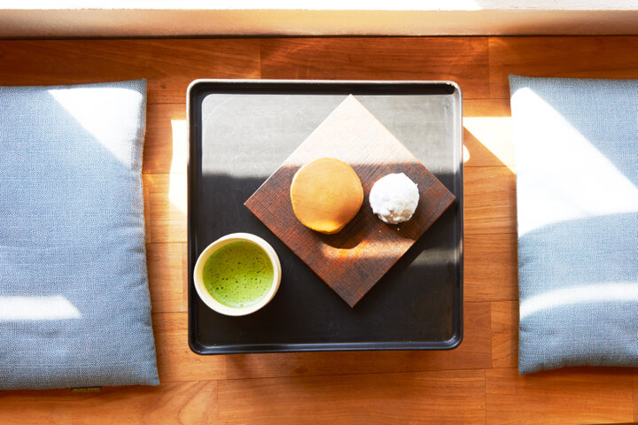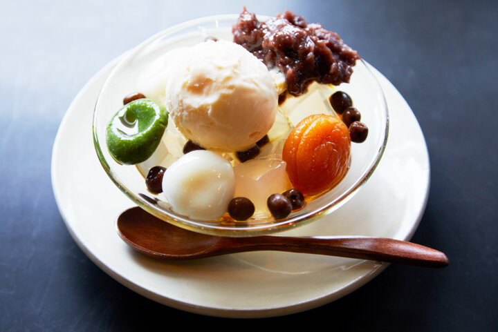 イートインでいただけるあんみつは上品ないでたち。甘すぎない餡は、つるりとした白玉といただくことで上品な味わいに。クリーミーなアイスクリームに黒蜜の香ばしい甘みが混じり合い、赤えんどう豆の塩見が大人好みのエッセンスに。食べるのがもったいないような、癒しのデザートに出会うことができました。