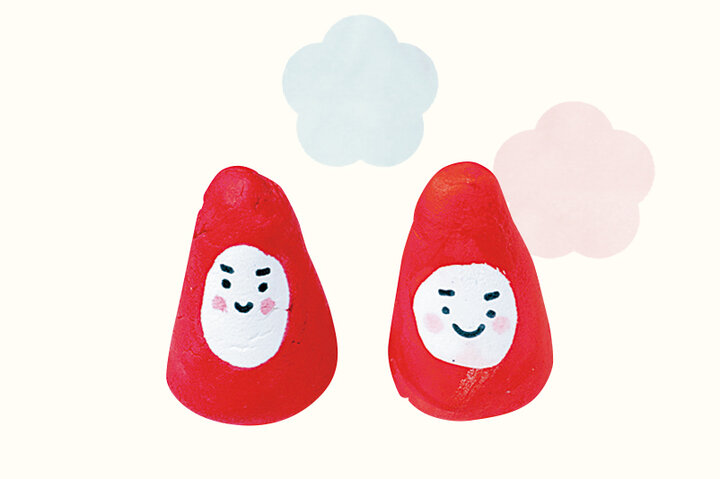 お守りだるまちゃん1個580円。にっこりした表情が愛らしい手描きのだるまちゃん