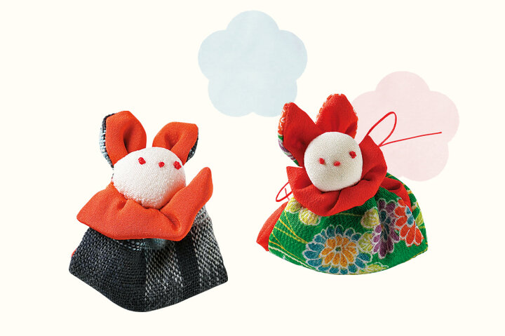 縁結びうさぎちゃん各1100円。和柄の布で作った幸運のうさぎは色・柄ともに豊富
