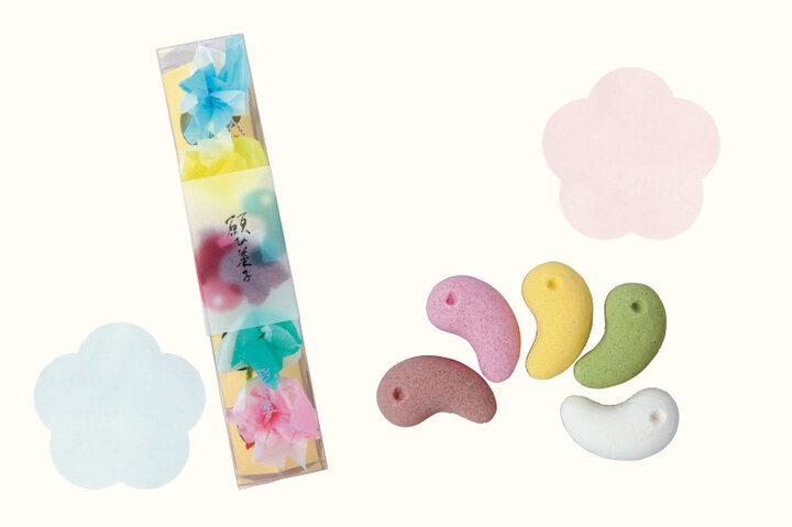 願ひ菓子(5個入)756円。口の中に入れるとやさしく溶ける勾玉型の干菓子。味は5種類