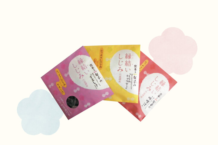 縁結いしじみ各378円。旨みたっぷりの宍道湖産のしじみを使った即席のしじみ汁。醤油、味噌、しじみチャウダー味がある