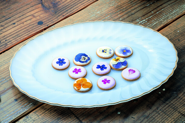 おはなクッキー(2個入)324円。奥出雲産のエディブルフラワーの押花を使ったクッキー ※人気商品のため、売り切れの時期あり