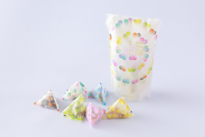 製造から販売までを一貫して手がける豆菓子専門店「豆福」。全国でも数少ない自社工房併設のお店で、さまざまな種類の豆菓子が作られています。なかでも特に人気の商品を少しずつ味わえるのが「豆だくさん」という詰め合わせです。古くから親しまれている定番商品で、内容やパッケージの見直しを重ね、2019年から現在の姿になりました。 花びらを散らしたような、華やかなデザインのパッケージは、釜の中で豆を転がして粉をまぶす〝粉まき〟という豆菓子の伝統的な製法をモチーフに。カラフルな花びらは、さまざまな味が楽しめることを伝えています。