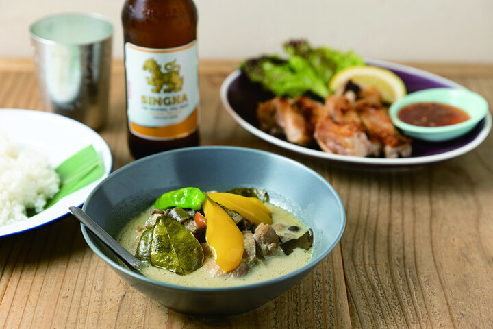 グリーンカレー1078円、名物ガイヤーン858円が定番人気。タイビール748円とマッチ