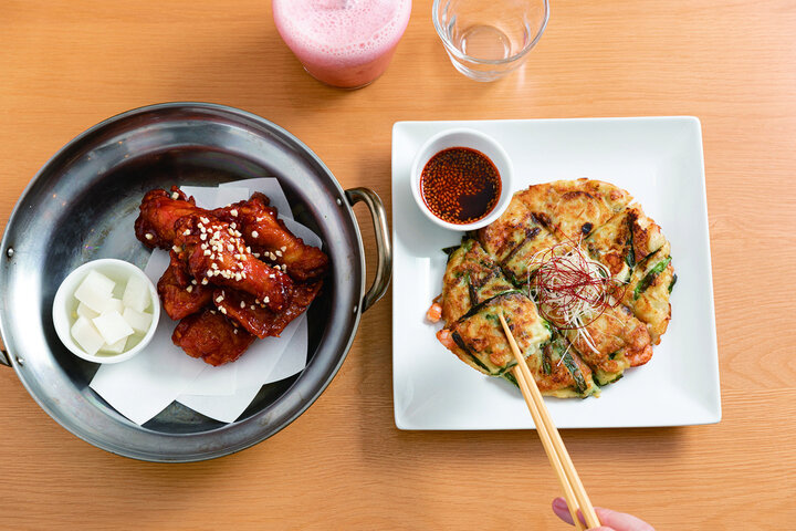 山芋を加えたサクフワ食感が魅力の海鮮チヂミ1100円と、ヤンニョムチキン1100円