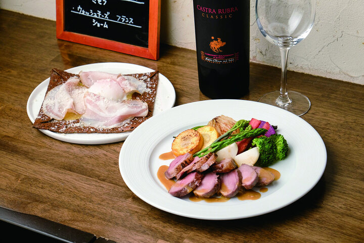 浜田産猪のロースト2500円、ガレット(コンプレット)600円、グラスワイン720円~
