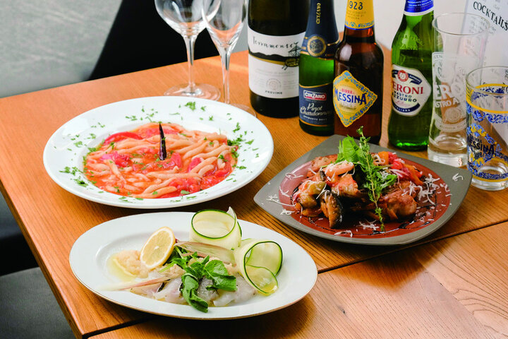 野菜や魚をはじめとした地産地消食材で作るイタリアの郷土料理が味わえる店。グリッシーニをまとわせたカツレツなど、アイデア豊かなひと皿は見た目も華やか。日替わりのおすすめメニューは、店内の黒板からオーダーして。