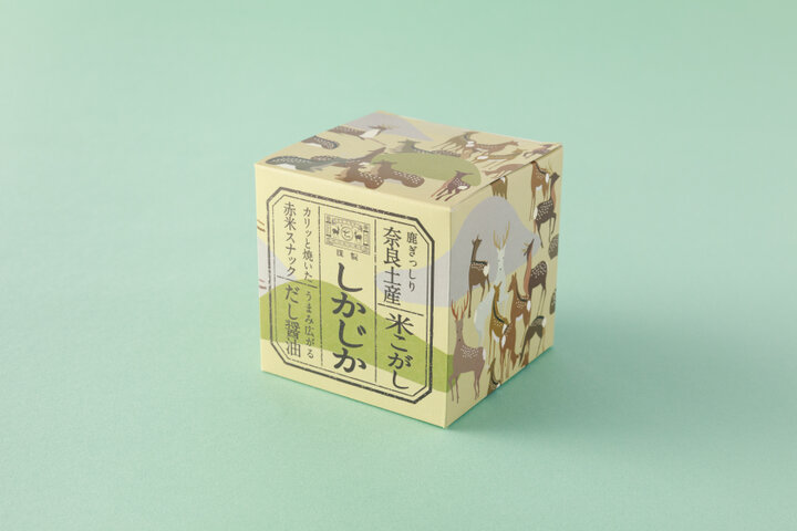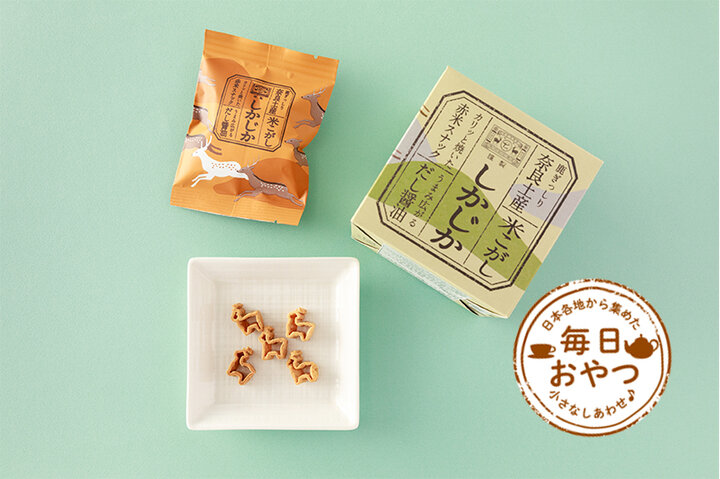 約1200頭の鹿が生息する奈良公園の風景を表現した、「中川政七商店」の「しかじか 米こがし」。箱には公園を行き交う鹿たちが描かれています。中に入った小袋を開けると、鹿の形をした小さなスナックがぎっしり。 スナックに使用しているのは、奈良県産の赤米。古代人が食べていたといわれる、栄養豊富なお米を生地に練り込み丁寧にローストしています。 今回ご紹介する「だし醤油」のフレーバーは、カリッとした食感、じゅわっと広がるだし醤油のうまみや香ばしさに手が止まらなくなります。
