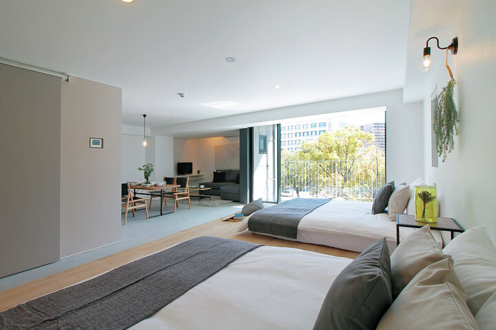 キッチンや家電を備える広々とした客室は、最大6人まで宿泊可能。ベッドはすべてクイーンサイズで、アメニティも充実しています。アーリーチェックインでは荷物の預かりサービスも。デリバリーや持ち込みも可能なので、まるで暮らすように宿泊を満喫できます。
