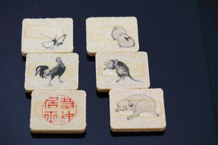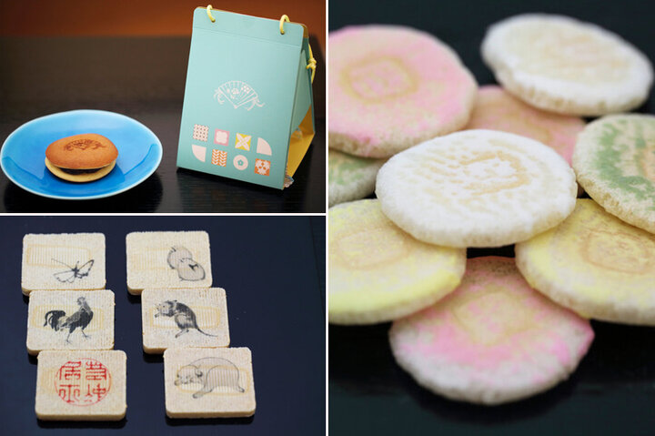 そして、近年では話題のスポットとのコラボレーションも積極的に行なっています。 京都・岡崎にある「細見美術館」とのタイアップで生まれたのが、「若冲墨画」。細見美術館が所蔵する京都の画家・伊藤若冲のユーモラスな作品をモチーフに、軽やかな麩焼き煎餅に描いたお菓子です。煎餅には、白砂糖と黒砂糖の2色の砂糖を引いているので、絵柄のユニークさと合わせて、甘みの違いのおもしろさも楽しめます。