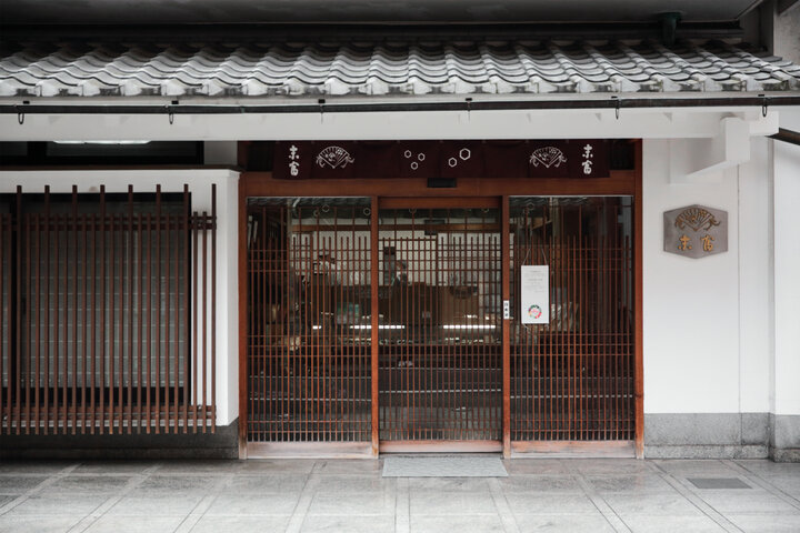 「末富」は地下鉄・五条駅から徒歩5分、烏丸松原を西に進んだ先、室町通の手前に位置します。どっしりとした間口の広い玄関には、「末富」の象徴でもある檜扇がデザインされたのれんが掛かっています。