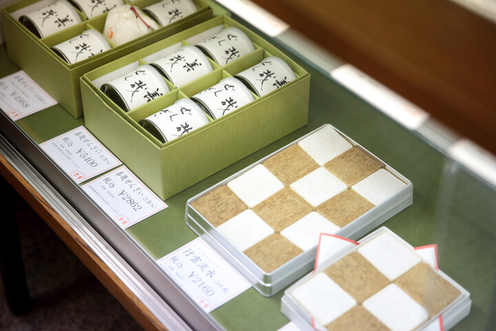 この檜扇は同じく京都にある老舗和菓子店「亀末廣(かめすえひろ)」にルーツがあるもの。元々「末富」は「亀屋末富」として、御所や武家、茶人を相手に商いをしてきた「亀末廣」から、屋号をもらうかたちで誕生しました。「亀末廣」でも使われている檜扇の意匠は「末富」の原点とも言える存在なのです。