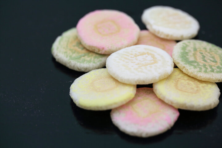 そんな「重ね色目」を小さな麩焼きせんべいで表現したのが、「京ふうせん」です。麩焼き煎餅をふうせんに見立て、基本の色目五色「赤・白・青・緑・黄」の砂糖で京の色目を表しています。はんなりやさしい色合いとふんわりとした食感は、その名の通り愛らしいふうせんを思い起こさせます。