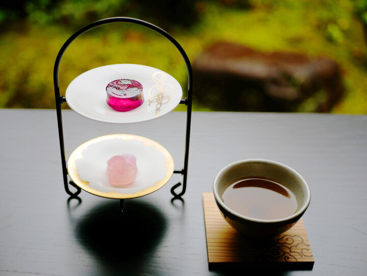 コースは、スイーツ5種とドリンク3種。内容は、その日その日で異なります。 (※この春から、スイーツ4種とドリンク3種で3500円に変更。よりお手軽に楽しめるようになります。) ひと皿目は、一口大の生琥珀と通常の乾燥した琥珀糖のコンビ。着色料は使わず、素材の色だけでパープルの濃淡が表現されています。ペアリングのほうじ茶は、もちろん京都産の宇治茶。これから始まるコースの前奏曲として、期待が高まりますね♪
