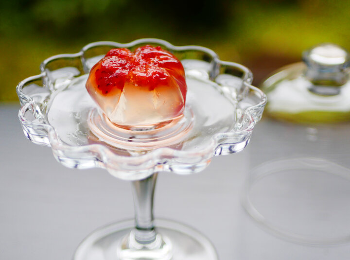 2品目は、季節のフルーツが入った大きめの生琥珀。ゼリーや寒天よりも弾力があり、生琥珀ならではのぶるんとした食感が魅力です。 「寒天をぐつぐつと煮詰めることで弾力が増し、独特の歯ごたえが出ます。以前はフォークを添えていましたが、つるんと滑ってしまうので今はお箸で食べてもらっています」と石井さん。