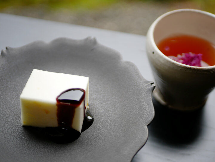 4品目は、メレンゲを寒天で固めた淡雪琥珀。酸味が強めのレモン味で、そこにバルサミコソースがかかっています。 見た目も、味にも変化があり、ちょうど懐石でいう箸休めのような役割です。また、箸を入れた際に出る「ギシッ」という音は、雪を踏みしめたときの音にそっくり。ペアリングの和紅茶にも有機バラが一輪浮かび、気分が華やぎます。