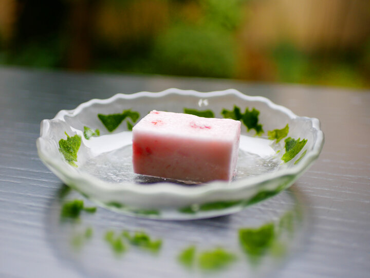 店主の石井佳鶴子さんは、ガラス作家、茶道教室の先生としての顔をもつマルチな方。海外からのお客様に茶道体験をする際、生菓子のあんこを好まれないゲストが多いことに悩んでいました。 そこで試しに出してみたのが琥珀糖。外側はシャリシャリ、内側はゼリーのように柔らか、その食感の違いが大いに受けました。やがて試行錯誤をするうちに、乾燥させる前の生の琥珀を、お客様にお出しできるのではないかと気づいたそうです。