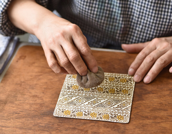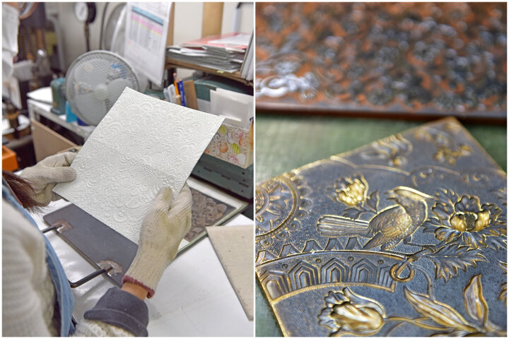 ひと目で心を奪われる、色鮮やかで愛らしい模様が生まれる工程を知りたくて、工房内の制作風景を見せていただきました。 型押しした模様に、職人の手で彩色を施す文庫革。まず、それぞれの製品に合わせた大きさに裁断した革に、プレス機を使って銅版の絵柄を型押しします。 「初期には、木製の型も使っていました。空襲で燃えてしまわないよう、池に投げ込んで避難したと聞いています」と、大切に保管している古い型を見せてくれたのは、販売統括の田中萌子さん。