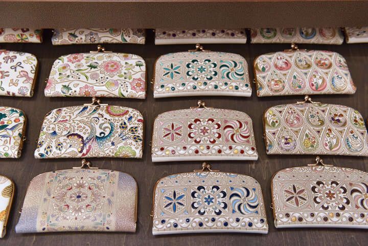 いちばんの人気は、がま口タイプの財布。女性の手になじみのいい大きさで、厚みがないにもかかわらずたくさん入るのが特徴。ほかに、長財布、三つ折り、札入れなどあり、どれも魅力的でひとつに決めるのが大変。4月後半からは、扇子や扇子袋も登場します。和装にも合わせやすく、この夏の浴衣用に選ぶのもいいですね。