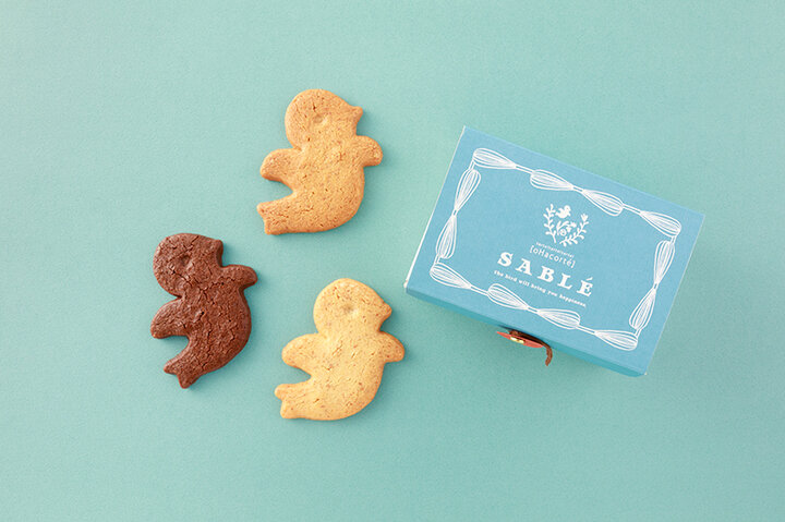 優しいブルーと白のツートーンカラーが爽やかな外箱は、留め口が玉ひも仕様になっています。玉ひもをほどいて包みを開けるときは、思わずワクワクしてきますよ。 包みを開けると、とりの形をした個包装のサブレが一列に並んで入っています。プレーンとショコラ、メイプルが各2枚ずつ。合計6枚のかわいらしいとりたちです。 とりサブレの生地は、フルーツタルト専門店[oHacorté]自慢のさくさくした食感のタルト生地をそのまま使っています。丁寧に焼きあげられたサブレはさっくりと軽い口あたりで、優しい甘さが口の中に広がります。