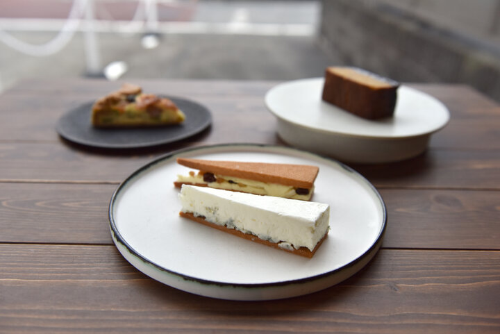 数あるお菓子の中でも、特に人気なのが「レーズンサンド」と「ブルーチーズケーキ」(各465円)」です。「レーズンサンド」は、サクサクのサブレに、発酵バターとホワイトチョコレートのクリーム、コクのあるウォッシュタイプのチーズを混ぜ込んだクリームと、ラム酒漬けのレーズンとクルミをサンド。 「ブルーチーズケーキ」は、ナチュラルチーズを使った口どけのよいムースに、ほんのり塩味がきいた羊乳製ブルーチーズを合わせたオトナな一品。どちらも濃厚な味わいなので、スイーツとしてはもちろん、ワインなどのお酒と合わせてもよさそうです。包装のデザインもおしゃれなので手みやげにも最適です。
