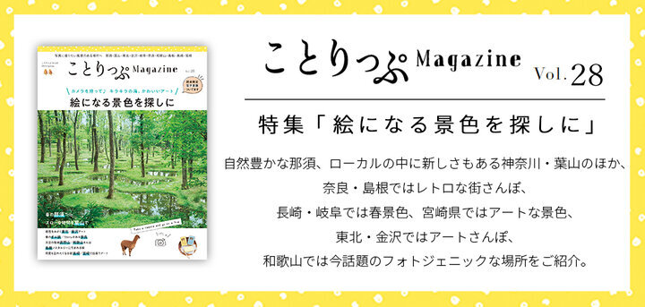 「ことりっぷマガジン春号 Vol.28」では、「森林ノ牧場」のほかにも那須エリアの素敵なスポットを多数紹介しています。芽吹いたばかりの草花、愛らしい動物たち、心ときめくアートやスイーツ。思わずパチリと写真を撮りたくなる、特別な出会いが待っています。ぜひご覧ください。