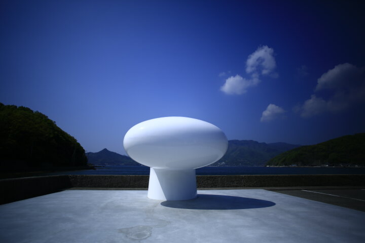 「二十四の瞳映画村」には、瀬戸内国際芸術祭で誕生したアートがもうひとつあります。海沿いの駐車場にたたずむ『愛のボラード』は、島内の人気作品『オリーブのリーゼント』を手がけたアーティスト、清水久和さんによるものです。海と空に映える真っ白な巨大立体オブジェで、思わず触れたくなるなめらかな曲線美が印象的。船を繋留するための岸壁にある柱(=ボラード)をモチーフにしているそうです。